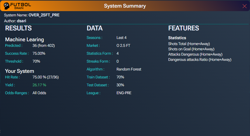 Machine learning system for Over 2.5 market in premier league, based on odds range. It
